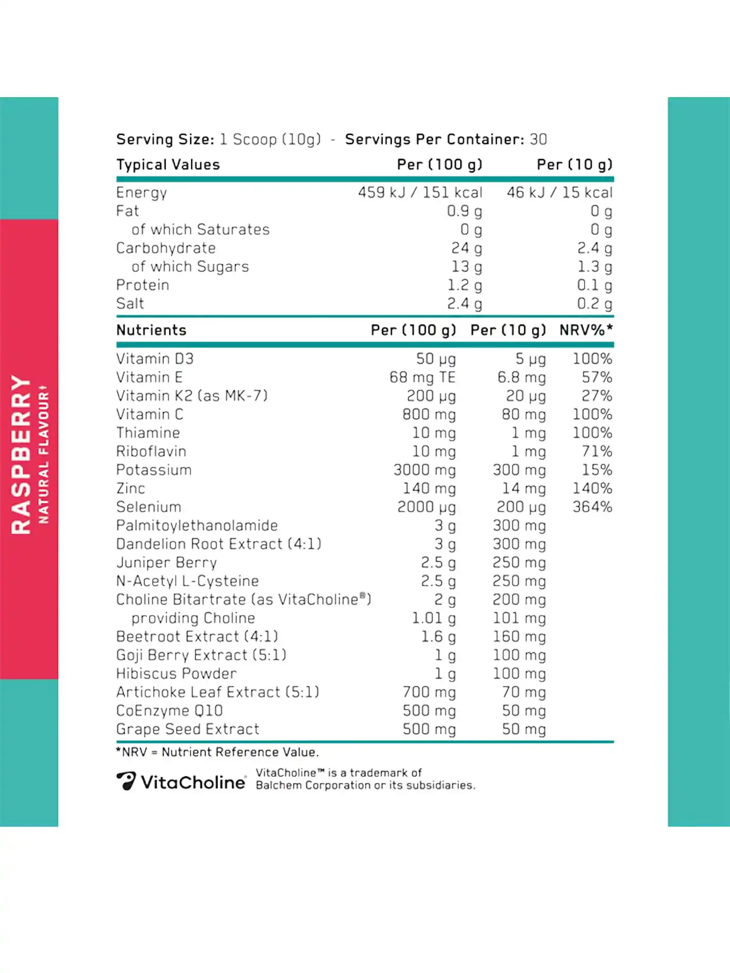 Vitamin D3 (5 μg), Vitamin E (6.8 mg), Vitamin K2 (MK-7) (20 μg), Vitamin C (80 mg), Thiamine (1 mg), Riboflavin (1 mg), Potassium (300 mg), Zinc (14 mg), Selenium (200 μg), Palmitoylethanolamide (300 mg), Dandelion Root Extract (4:1) (300 mg), Juniper Berry (250 mg), N-Acetyl L-Cysteine (250 mg), Choline Bitartrate (VitaCholine®) (200 mg) providing 101 mg Choline, Beetroot Extract (4:1) (160 mg), Goji Berry Extract (5:1) (100 mg), Hibiscus Powder (100 mg), Artichoke Leaf Extract (5:1) (70 mg), CoEnzyme Q10 (50 mg), Grape Seed Extract (50 mg).
